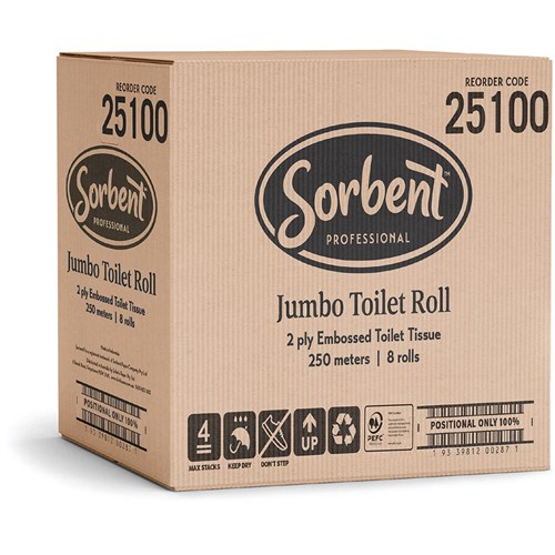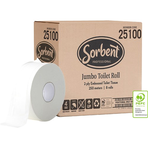 • Sorbent Professional Jumbo Toilet Tissue Rolls 2 Ply 250m Carton Of 8