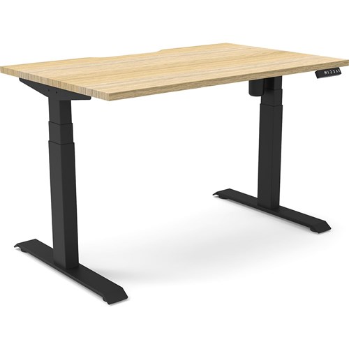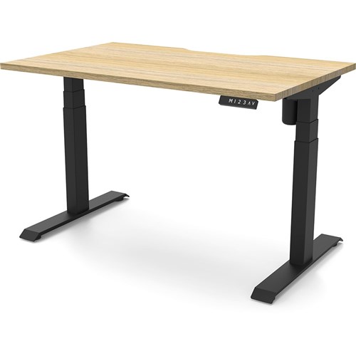 Natural Oak top with Black frame. Unit Dimension: 1200mm W x 750mm D x 620-1270mm H. E0 rated top. Powdercoat base. Digital control panel with 3 pre-set positions, LED display panel, keypad safety lock & reminder alarm setting. Anti-collision technology, noise emission of less than 50DB. Lifting capacity of 80kg with a max speed of 25mm per second. 700mm wide foot size with adjustable leveling feet. 10 Year Manufacturer's Warranty. Delivery, installation and assembly charges may apply to furniture. Please enquire to confirm.