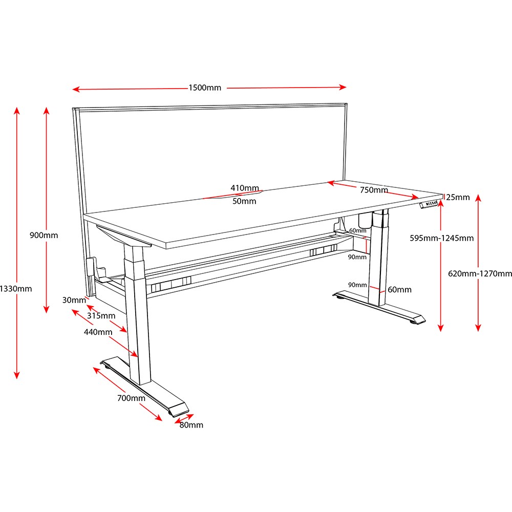 White top with White frame. Unit Dimension: 1500mm W x 750mm D x 620-1270mm H. Comes with cable tray for cable management. E0 rated top. Powdercoat base. Digital control panel with 3 pre-set positions, LED display panel, keypad safety lock & reminder alarm setting. Anti-collision technology, noise emission of less than 50DB. Lifting capacity of 80kg with a max speed of 25mm per second. 700mm wide foot size with adjustable leveling feet. 10 Year Manufacturer's Warranty. Delivery, installation and assembly charges may apply to furniture. Please enquire to confirm.