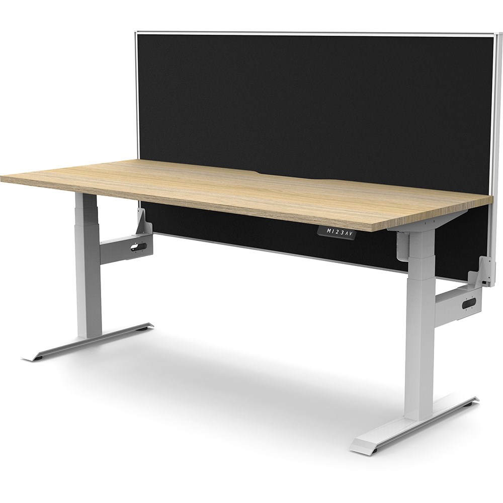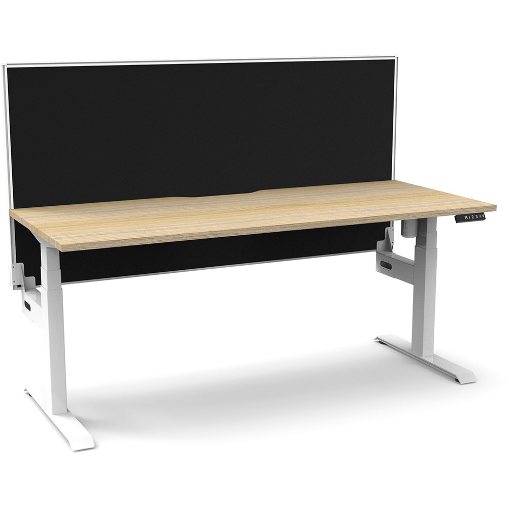 Natural Oak top with White frame. Unit Dimension: 1500mm W x 750mm D x 1330mm H. 620-1270mm height range for desk. E0 rated top. Powdercoat base. Digital control panel with 3 pre-set positions, LED display panel, keypad safety lock & reminder alarm setting. Anti-collision technology, noise emission of less than 50DB. Lifting capacity of 80kg with a max speed of 25mm per second. 700mm wide foot size with adjustable leveling feet. Comes with 30mm thick privacy screen. 10 Year Manufacturer's Warranty. Delivery, installation and assembly charges may apply to furniture. Please enquire to confirm.