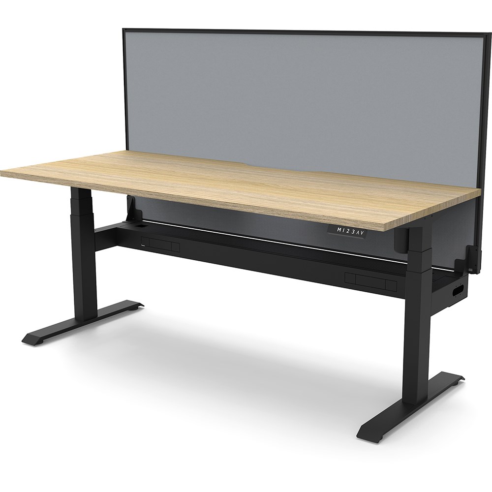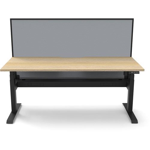 Natural Oak top with Black frame. Unit Dimension: 1500mm W x 750mm D x 1330mm H. 620-1270mm height range for desk. E0 rated top. Powdercoat base. Digital control panel with 3 pre-set positions, LED display panel, keypad safety lock & reminder alarm setting. Anti-collision technology, noise emission of less than 50DB. Lifting capacity of 80kg with a max speed of 25mm per second. 700mm wide foot size with adjustable leveling feet. Comes with 30mm thick privacy screens and cable tray for cable management. 10 Year Manufacturer's Warranty. Delivery, installation and assembly charges may apply to furniture. Please enquire to confirm.