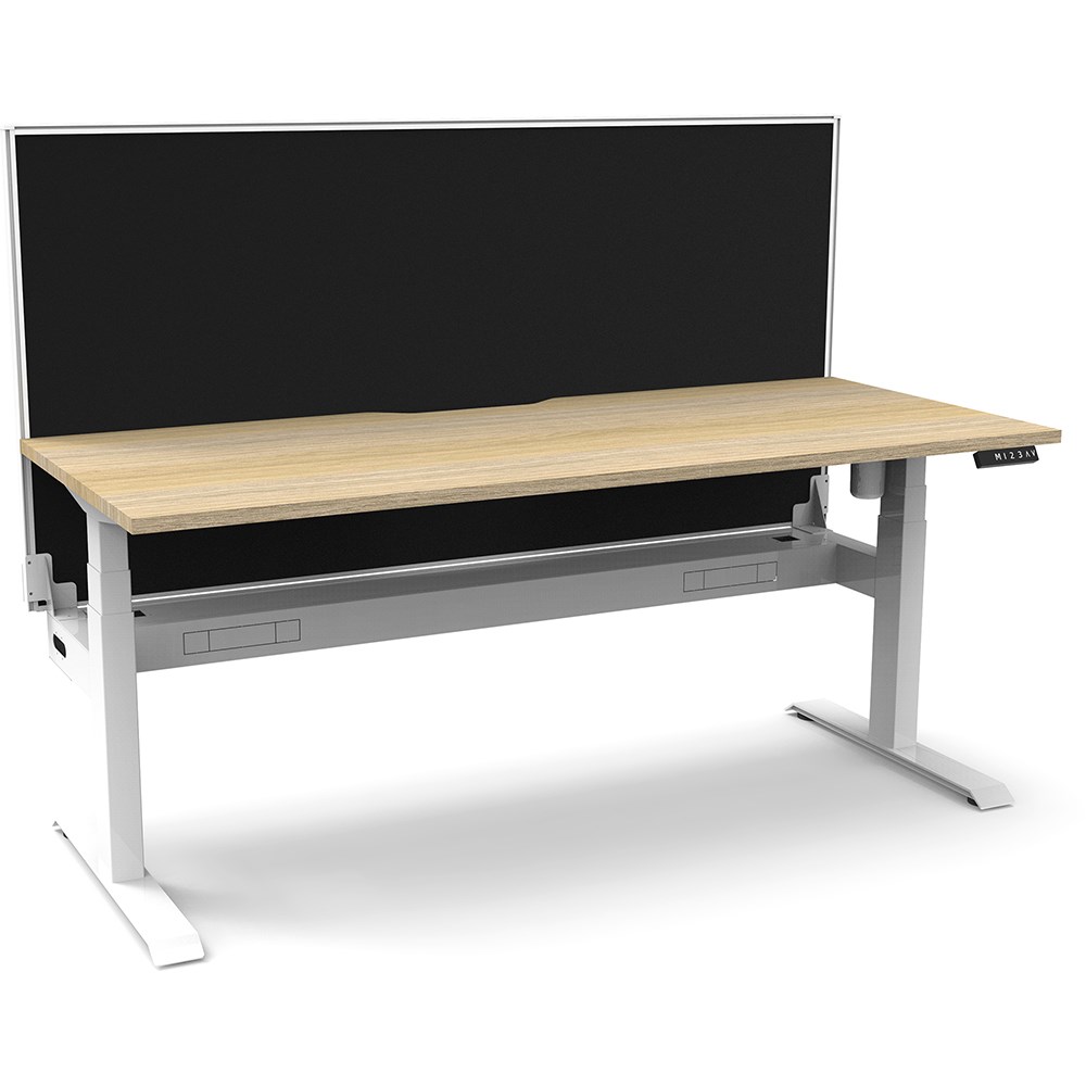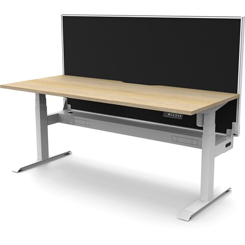 Natural Oak top with White frame. Unit Dimension: 1800mm W x 750mm D x 1330mm H. 620-1270mm height range for desk. E0 rated top. Powdercoat base. Digital control panel with 3 pre-set positions, LED display panel, keypad safety lock & reminder alarm setting. Anti-collision technology, noise emission of less than 50DB. Lifting capacity of 80kg with a max speed of 25mm per second. 700mm wide foot size with adjustable leveling feet. Comes with 30mm thick privacy screens and cable tray for cable management. 10 Year Manufacturer's Warranty. Delivery, installation and assembly charges may apply to furniture. Please enquire to confirm.