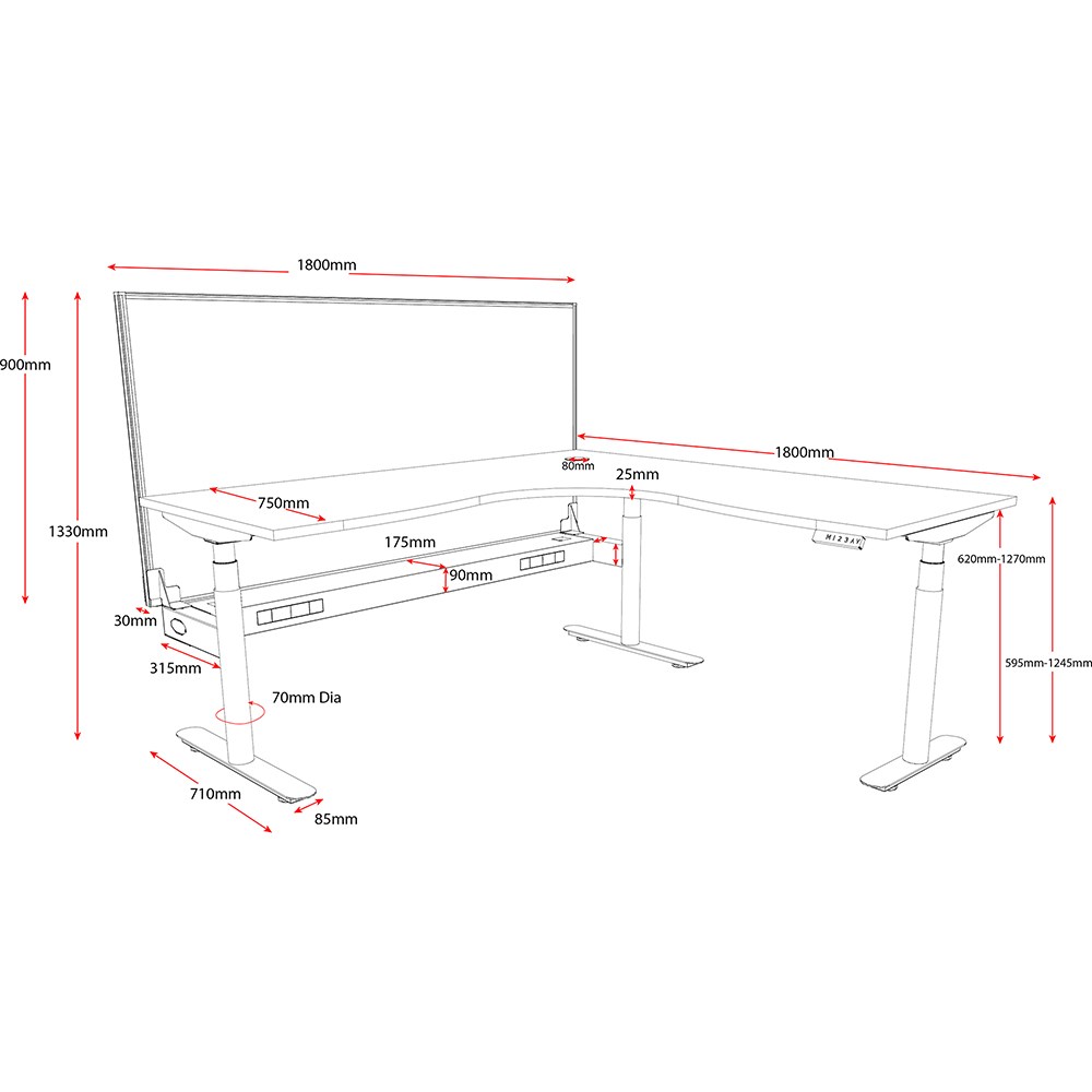 Natural Oak top with White frame. Unit Dimension: 1800/1800mm W x 750mm D x 1330mm H. 620-1270mm height range for desk. E0 rated top. Powdercoat base. Digital control panel with 3 pre-set positions, LED display panel, keypad safety lock & reminder alarm setting. Anti-collision technology, noise emission of less than 50DB. Lifting capacity of 120kg with a max speed of 38mm per second. 70mm diameter round column legs. 700mm wide foot size with adjustable leveling feet, return foot: 700mm. Comes with 30mm thick privacy screens and cable tray for cable management. 10 Year Manufacturer's Warranty. Delivery, installation and assembly charges may apply to furniture. Please enquire to confirm.
