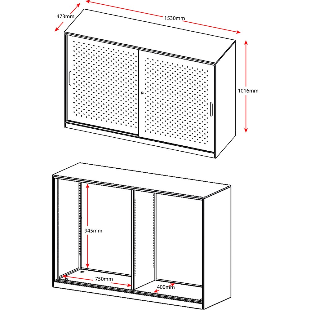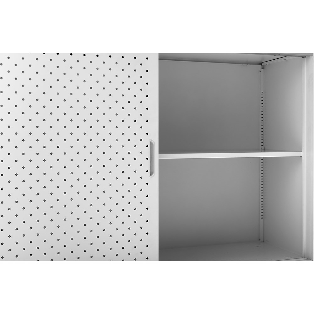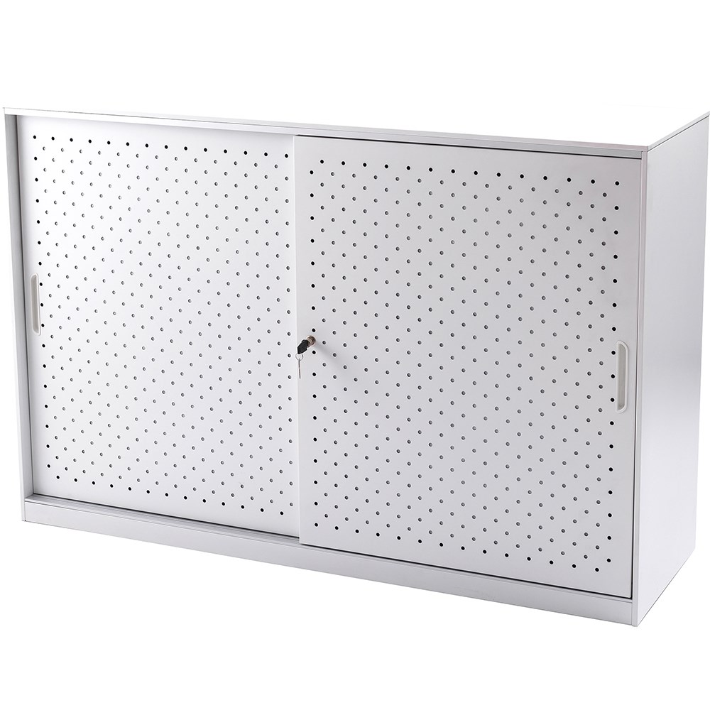 GO perforated sliding door cupboard with 2 doors. Includes 2 x adjustable shelves - 1 on each side. Perforated door feature with internal acoustic panel for sound absorption. Adjustable leveling feet. Soft closing track system. Lockable doors - comes with 2 keys. 10 Year Manufacturer's Warranty. Delivery, installation and assembly charges may apply to furniture. Please enquire to confirm.
