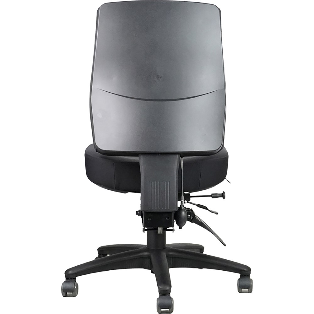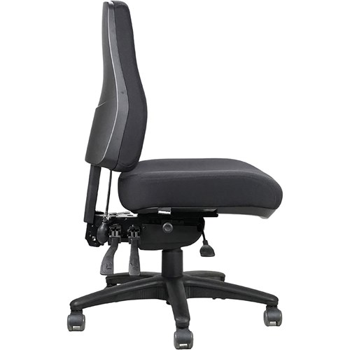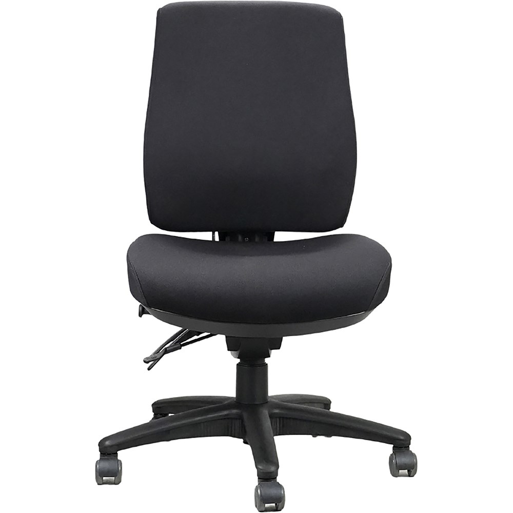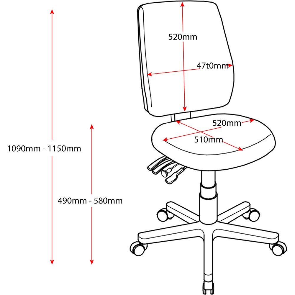 Fully ergonomic 4 lever heavy duty mechanism with seat slide. Fully upholstered. Heavy duty five star spider base with 50mm hard floor castors. Pneumatic lumbar pump adjustment. Luxurious heavy duty moulded foam seat. AFRDI load rated to 160kg. Overall Size of 520mm W x 600mm D x 980 - 1130mm H. Seat size of 520mm W x 510mm D, seat height of 490 - 580mm H. Optional adjustable armrest available. Refer to product code 2834421. 10 Year Manufacturer's Warranty. Delivery, installation and assembly charges may apply to furniture. Please enquire to confirm.