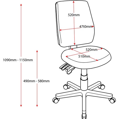 • Seat size of 520mm W x 510mm D, seat height of 490 - 580mm H.