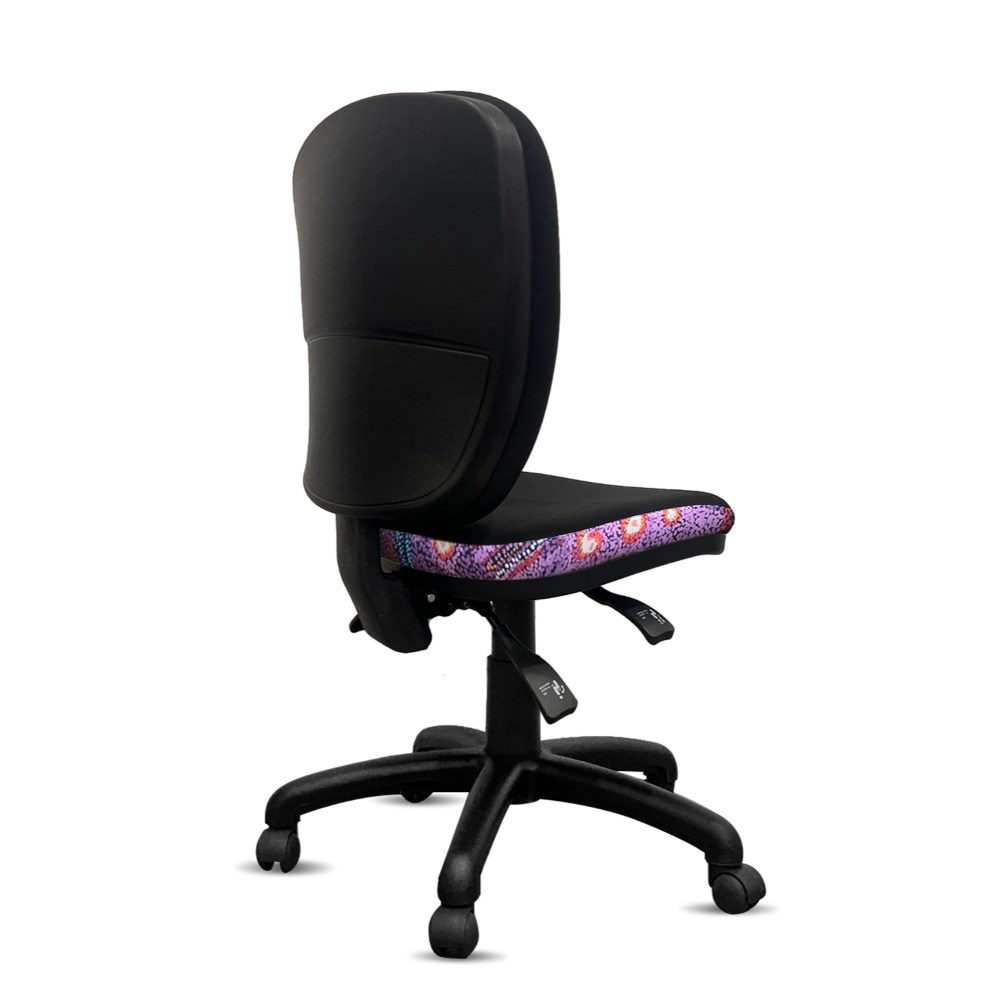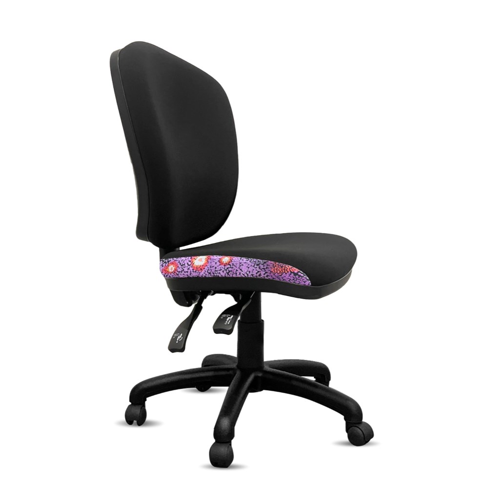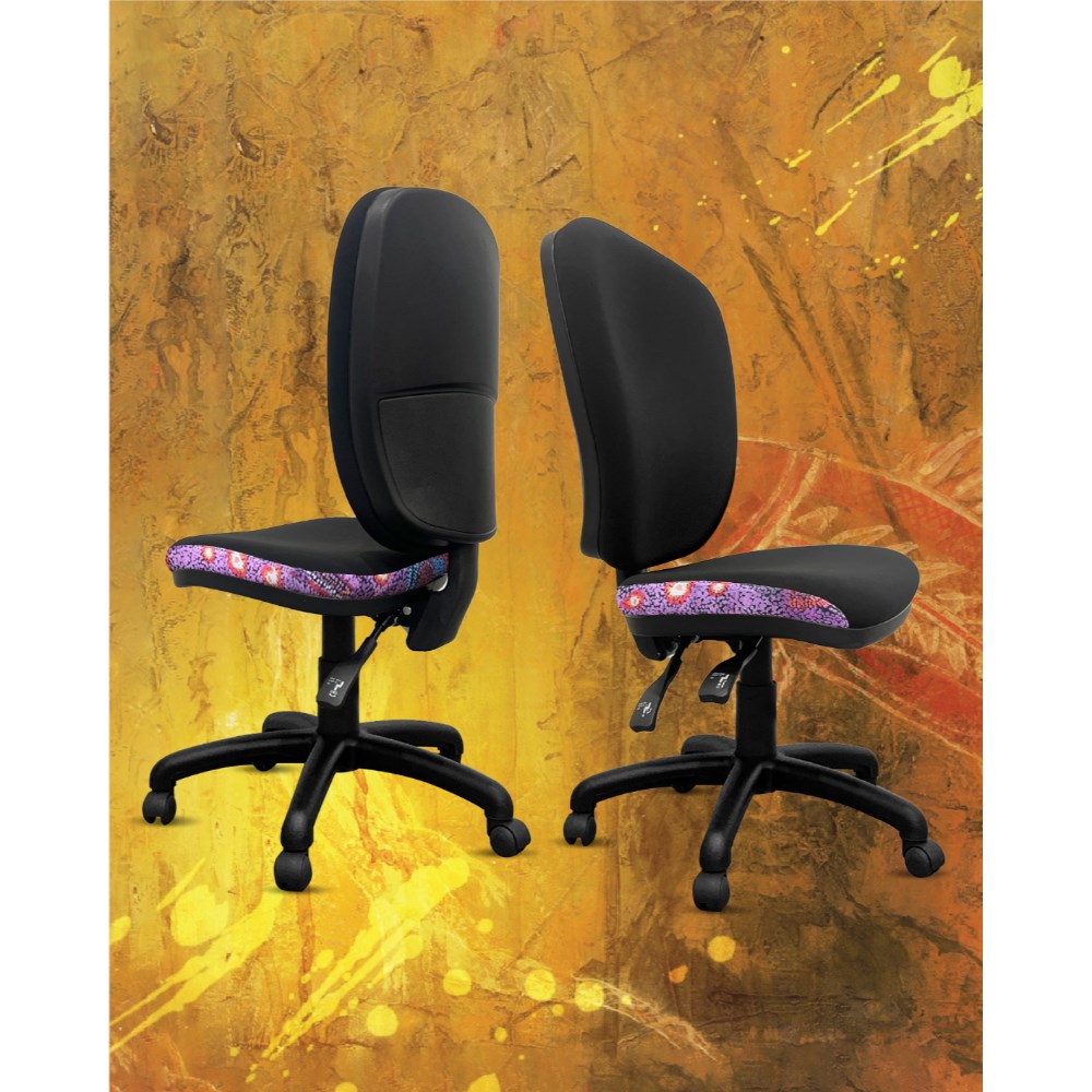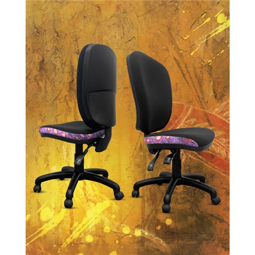 A unique commercial fabrics designed by Andrea Adamson (Indigenous Artist) combined with K2 Black Fabric to upholster the chair. Weight rating: AFRDI Rated Load 160kg Approved. Indicated seat hours: 24/7. Seat Dimensions: 510W x 490D x 460-590mmH. Back Height: 460mm. Back Width: 460mm. Heavy duty commercial chair with 3 lever mechanism and ratchet back height adjustment. 5 way 700mm commercial grade nylon base. Heavy duty gas lift cylinder. Moulded seat foam for supreme comfort. Fire retardant contoured moulded foam. Product image for reference only. Design pattern may differ as a result of variations in the art work. 10 Year Years Manufacturer's Warranty. Delivery, installation and assembly charges may apply to furniture. Please enquire to confirm. Optional adjustable armrest available. Refer to product code 3043352.