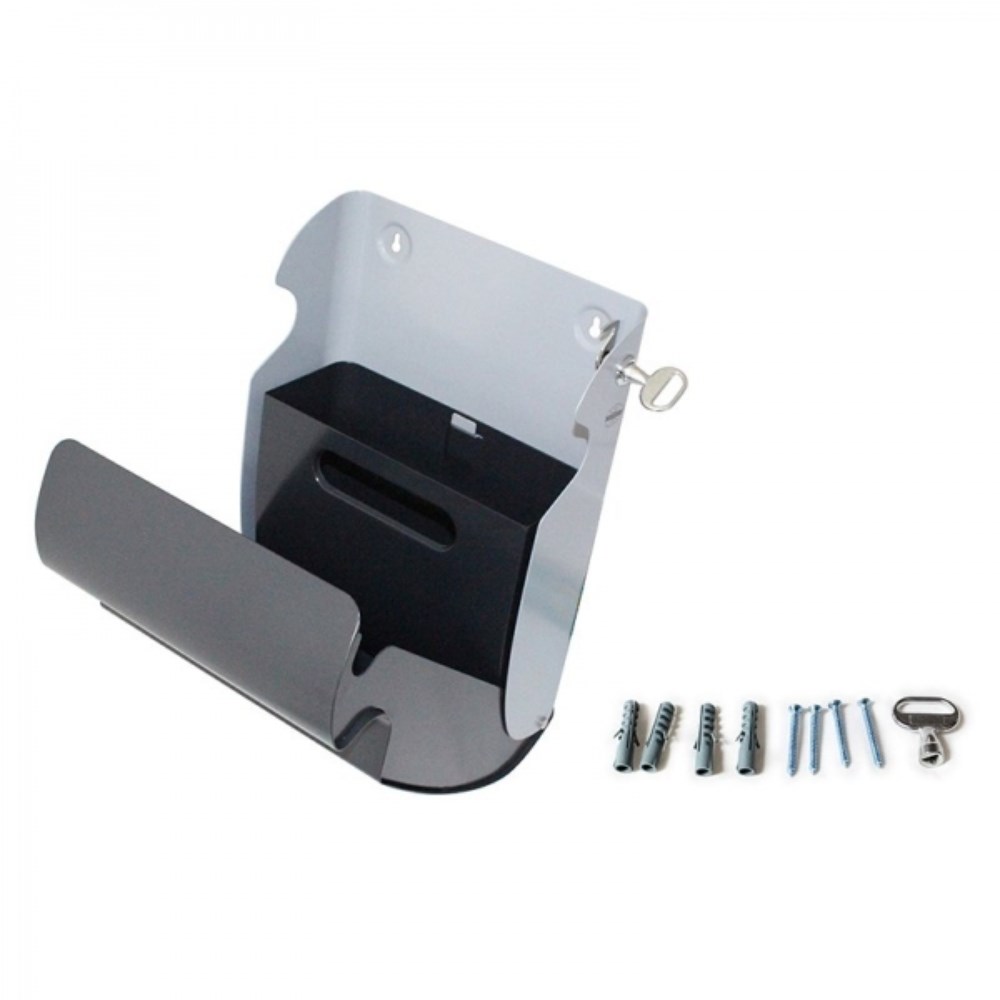 Durable powder coated finish. Liner with handle for easy emptying. Complete with mounting screws. Key for locking. Volume: 3.3 litres. Size: 240W x 95D x 320mmH.