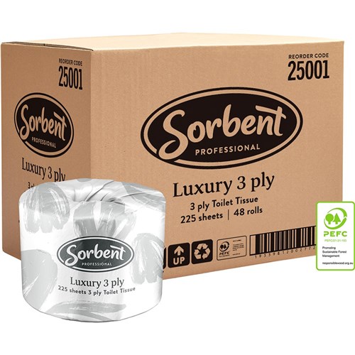 • Sorbent Professional Luxury Toilet Tissue Rolls 3 Ply 225 Sheets Carton Of 48