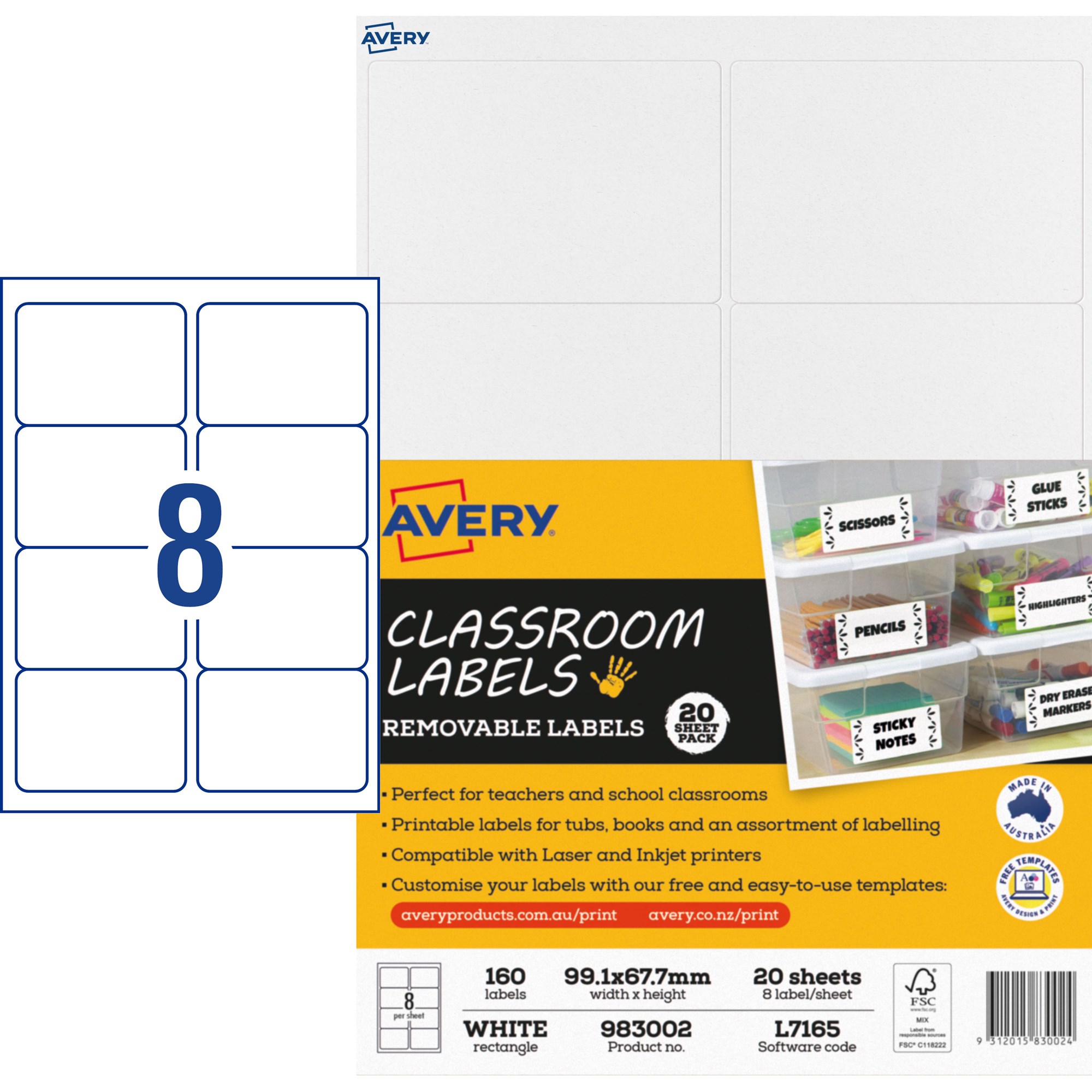 • Avery Classroom Labels Laser Printer 99.1 x 67.7mm White 8UP 160 Labels
