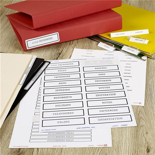 • Specially designed labels to fit the spine of lever arch, ring binders, elasticated folders, box files, suspension files, document wallets and square cut folders.