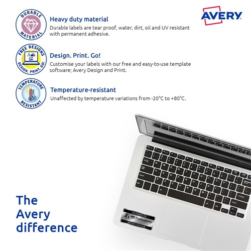 Engineered to take on tough applications where a standard label is not fit for purpose. Durable labels are tear proof, water, dirt, oil and UV resistant with permanent adhesive. Ideal for asset identification on computers, laptops, tablets, tools, labelling medications, samples and containers for use in refrigerators. Unaffected by temperature variations -40°C to +150°C. Customise your labels with Avery Design and Print, available at averyproducts.com.au/print. Size: 96x50.8mm 200 labels, 20 sheets. 10 labels per sheet (10UP).