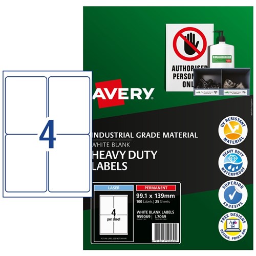 Heavy duty, waterproof, UV, oil and tear resistant unaffected by temperatures between -20°C to 80°C. Ideal for labelling equipment and organising property. Engineered to take on tough applications where a standard label is not fit for purpose. Customise your labels with Avery Design and Print, available at averyproducts.com.au/print. Made in Australia. Size: 99.1x139mm 100 labels, 25 sheets. 4 labels per sheet (4UP).