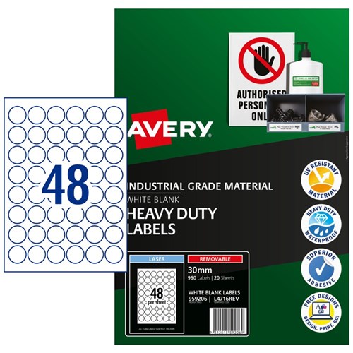 • Avery Identification Removable Heavy Duty Laser White L4716 30mm Round 48UP 960 Labels