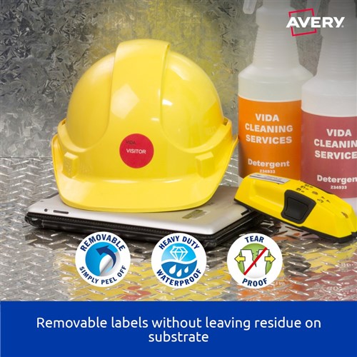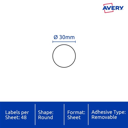 Weather, UV, oil and dirt resistant. Unaffected by temperature variations -20°C to +80°C. Removable adhesive formulated to adhere to a wide variety of surfaces without leaving residue. Ideal for creating temporary labelling of equipment, facilities and storage supplies, stock take and organising workshops. Customise your labels with Avery Design and Print, available at averyproducts.com.au/print. Size: 30mm diameter 960 labels, 20 sheets. 48 labels per sheet (48UP).