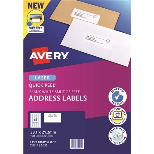 SureFeed™ technology is engineered to help provide a more reliable feed through your printer. Address Labels have Quick Peel™ Pop-up Edge™ making peeling the label faster and easier, simply bend back the sheet and the edge pops up, just peel and apply 12-65 up. Jam-Free reliability for trouble free printing, saving time and minimising wastage. Labels use Opaque TrueBlock® technology which completely covers everything underneath. Customise your labels with Avery Design and Print, available at averyproducts.com.au/print. FSC® certified labels made with paper from well-managed forests. Made in Australia. Size: 38.1x21.2mm 1625 labels, 25 sheets. 65 labels per sheet (65UP).