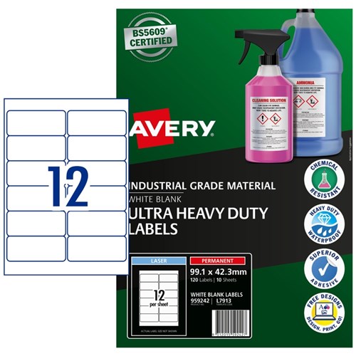 • Avery Ultra-Resistant Chemical Grade Laser Labels L7913 99.1x 42.3mm White Pack of 10 (120)
