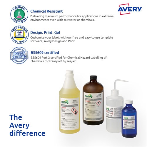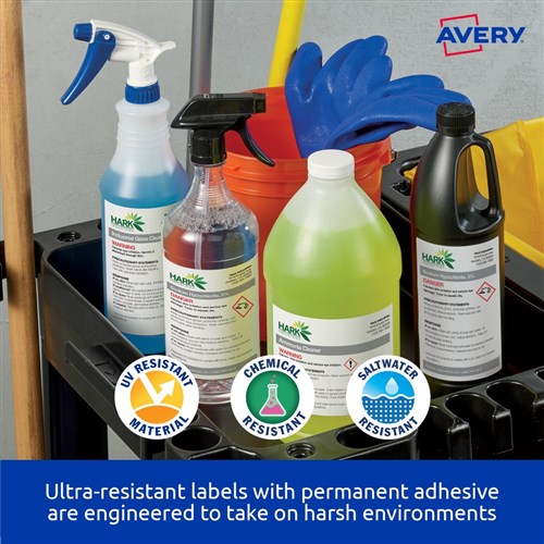 Ultra-Resistant Labels are saltwater resistant and certified for GHS Chemical Labelling with permanent adhesive and engineered to take on harsh environments. Unaffected by temperature variations -40?C to +150?C. Ideal for chemical labelling requirements and for onsite chemical decanting. Used in marine and harsh environments, ideal for safety signs, arc flash and tanks. Customise your labels with Avery Design and Print, available at averyproducts.com.au/print. Size: 99.1x42.3mm 120 labels, 10 sheets. 12 labels per sheet (12UP).