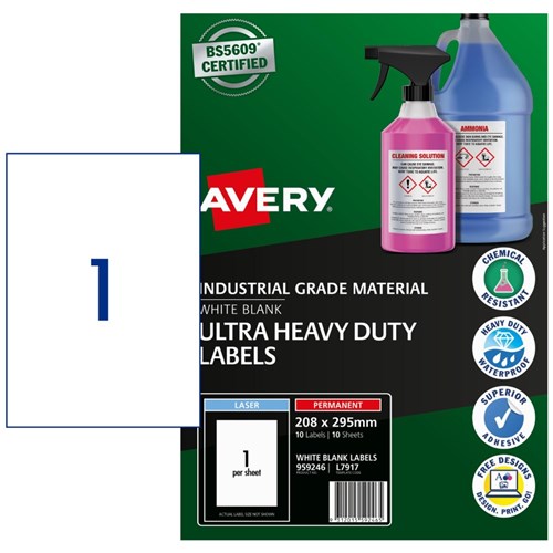 Ultra-Resistant Labels are saltwater resistant and certified for GHS Chemical Labelling with permanent adhesive and engineered to take on harsh environments. Unaffected by temperature variations -40?C to +150?C. Ideal for chemical labelling requirements and for onsite chemical decanting. Used in marine and harsh environments, ideal for safety signs, arc flash and tanks. Customise your labels with Avery Design and Print, available at averyproducts.com.au/print. Size: 208x295mm 10 labels, 10 sheets. 1 label per sheet (1UP).