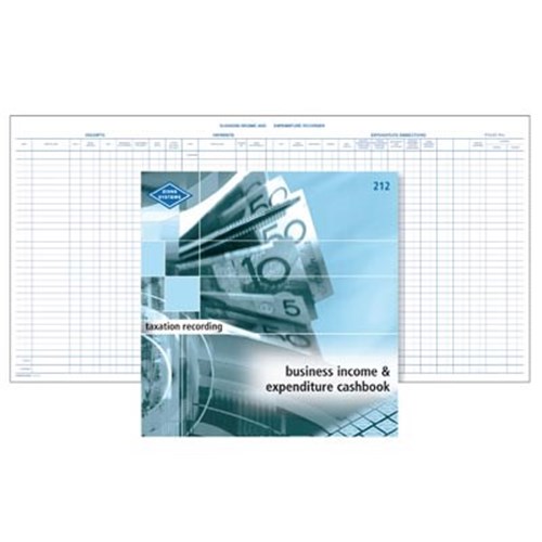 Headed cash book, popular as a basic record for income tax purposes. Laminated cover, wire stitched, 27 pages per book, 31 lines per page.