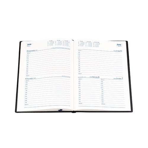 Bound in a highly durable, welded PVC padded cover. Printed on white paper, week numbers and Julian days. Features ribbon marker 2 days to a page layout. Appointment times from 8am - 5pm hourly. Australian and New Zealand Holidays. 3 year calendars. Current and forward year planners. International dialling and time zones. Staff leave planner. Addresses and notes. Size: 210 x 148mm. FSC Certified.