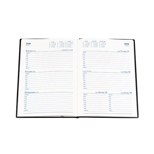 Bound in a highly durable, welded PVC padded cover. Printed on white paper, week numbers and Julian days. Features ribbon marker week to view layout. Appointment times from 9am - 5pm hourly. Australian and New Zealand Holidays. 3 year calendars. Current and forward year planners. International dialling and time zones. Staff leave planner. Addresses and notes. Size: 210 x 148mm. FSC Certified.