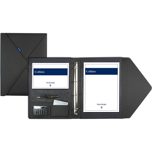 All Collins Portfolios featuring a two tone cover contrast stitching printed lining pen loop A4 feint ruled pad & to do pad Feature a 4 ring binder calculator business card holder All come with the option of refilling with either note pad or note book