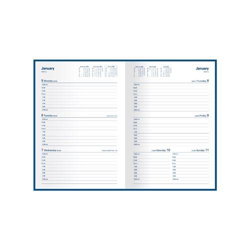 Hardwearing, linen-look cover. Extensive range of internal features, including notes, planners and essential information. Lay flat opening, ribbon marker, week to view layout. Appointment times from 9am -5pm hourly. Australian and New Zealand holidays. 3 year calendars. Current and forward year planners. Monthly planners, addresses and notes. Tax information, staff leave and financial summary. International holidays and International dialling. Size: 210 x 148mm. FSC Certified.