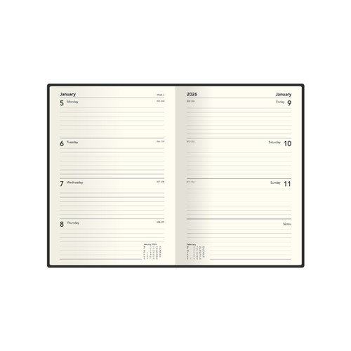 Textured fabric cover. 3 year calendars. Current and forward year planners. Financial summary. International holidays. International dialling. Lay flat opening, ribbon marker and elastic closure. Size: 210 x 148mm. FSC Certified.