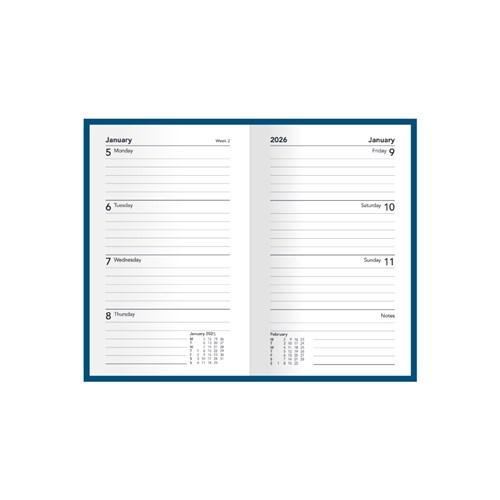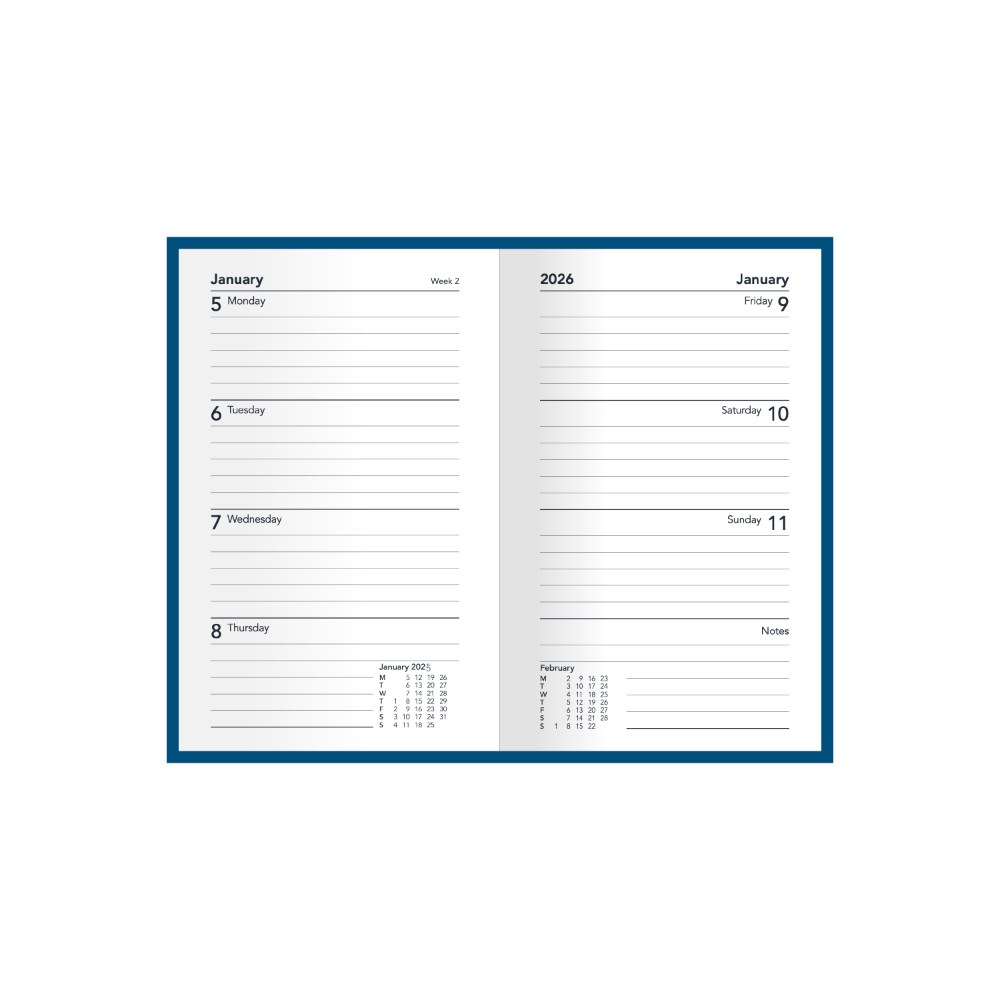 Soft touch padded cover. Ribbon marker. 3 year calendars. Current and forward year planners. Financial summary. International holidays. International dialling. Size: 125 x 80mm. FSC Certified.