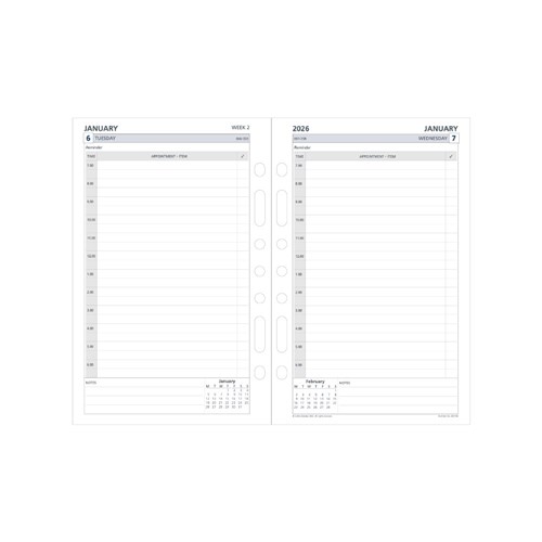 Printed on quality white paper. Collins refills will fit most leading brand organisers of a smaller size. Page Size: 140mm x 216mm. 3 year calendars. Year planner. International holidays. 7 ring. Hourly appointment time. Note pages. FSC Certified.