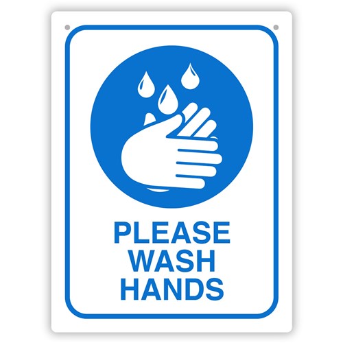 Size: 225W x 300mmH. Sign is white and blue. Wording: Please Wash Hands (with pictogram). Manufactured from high-quality polypropylene for strength and durability. Ideal for communicating to customers, staff or any other group of people, to wash their hands. Suitable to display both indoors or outdoors. The two holes at the top of each sign allow it to be attached to fences or walls using nails or screws. Light enough to be fixed using double sided tape or hook and loop adhesives. Made in Australia.