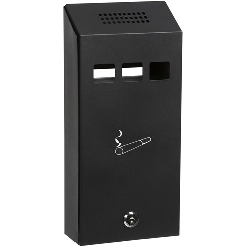 Wall mountable. Durable powder coated steel. Removable collection box - cylinder lock with 2 keys. Supplied with 4 mounting plugs and screws. Dimensions: 125W x 88D x 305mmH.