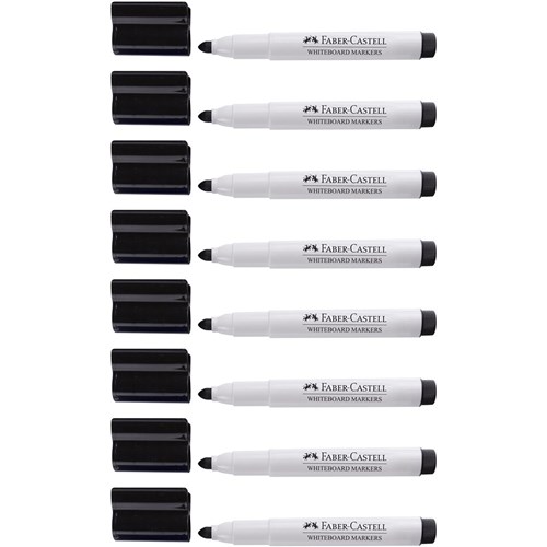 Includes 8 BLACK ONLY Faber-Castell Connector Pen Whiteboard Markers Big 3mm Bullet tips for better line visibility on large boards Convenient connector caps allow for quick and easy storage Bright, vibrant colours help to organise big ideas Ink effortlessly dr-erases for easy, residue-free clean-up Durable felt-nibs create consistent, precise lines Long-lasting ink means fewer marker replacements Whiteboard ink is safe and non-toxic for peace of mind 100 hour super cap off time