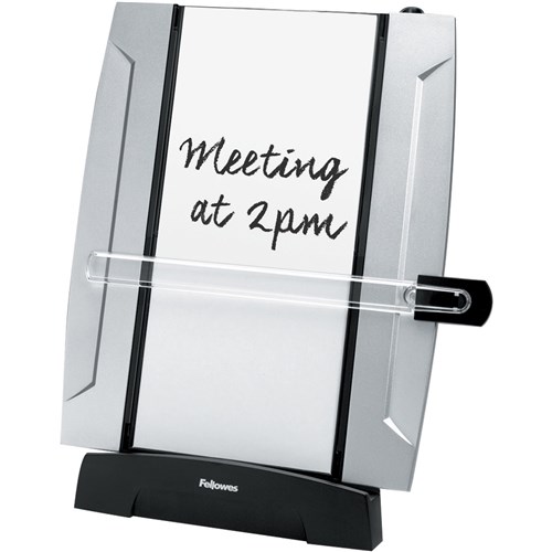 Places documents at eye level to prevent neck strain. Three-in-one - document holder, memo board and clipboard. Line guide moves up and down and swings out of the way when not in use. Adjustable copy clip holds up to 150 sheets and adjusts to accommodate various paper sizes. Adjustable height (45 degrees) for customised viewing angle. Dry erase memo board is ideal for quick reference notes or reminders. Dimensions: 256W x 79D x 333mmH. (Approximate). 5 Year manufacturer's warranty.