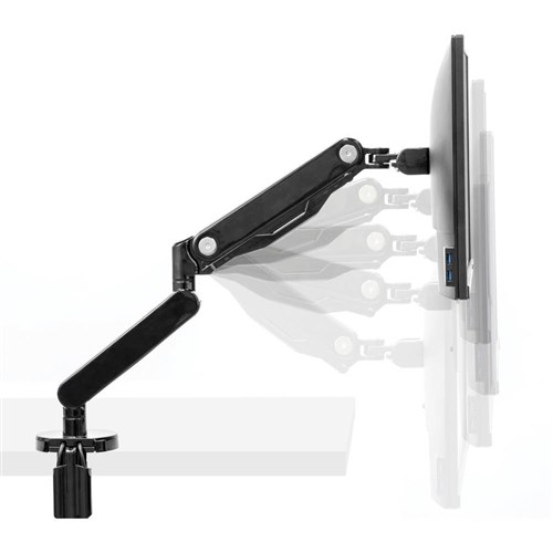 Fully independent adjustable monitor arms, with 360 degrees rotation via innovative gas spring technology allowing for effortless movement. Easily mounted via clamp or grommet. Holds a monitor up to 8kg (up to 40 inch monitors) and meets VESA mounting standards. 2 x 3.0 USB ports 0.5A (Type A0) built-in located at the base of the product makes it easy to connect your favourite devices. Intuitive cable management system helps minimise clutter. VESA 75 x 75 and 100 x 100 compliant. Specifications: 90 degrees tilt, 180 degrees pan, 360 degrees rotation. 5 Year Manufacturer's Warranty.