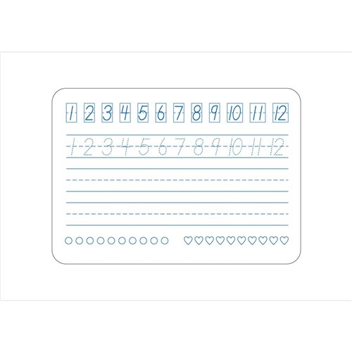 Features numbers 1 to 12. Supplied with whiteboard marker and eraser. Pre-printed ruled guides to assist in the development of hand writing skills. Reverse side can be utilised as a plain whiteboard.
