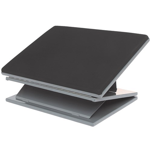 450mm x 300mm platform. Height and angle adjustable. Adjustable from 0 degrees to 36 degrees. Adjustable without moving from your chair. Independent height (up to 25cm) and slope adjustments. Strong steel construction with Memory Foam top.