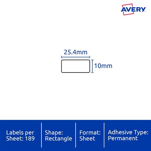 Engineered to take on tough applications where a standard label is not fit for purpose. Durable labels are tear proof, water, dirt, oil and UV resistant with permanent adhesive. Ideal for asset identification on computers, laptops, tablets, tools, labelling medications, samples and containers for use in refrigerators. Unaffected by temperature variations -40°C to +150°C. Customise your labels with Avery Design and Print, available at averyproducts.com.au/print. Size: 25.4mmx10mm 3780 labels, 20 sheets. 189 labels per sheet (189UP).