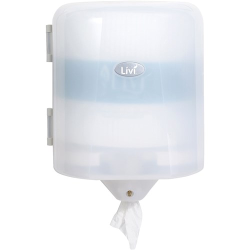 The centrefeed dispenser is a hygienic centrefeed dispensing solution that allows for quick fills with side access. The nozzle is adjustable allowing for flexible dispensing and flow control. It can hold up to 300m roll allowing quick and easy access when required. This dispenser is ideal for areas where frequent washing and cleaning is required, like care facilities, commercial kitchens or even back of house. Suits Livi hand towel 1203. Dimensions: 245L x 230W x 295mmH.