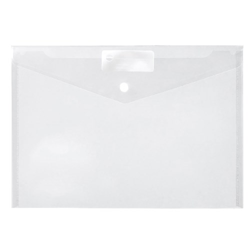 Stylish transparent document holder that is strong and versatile, with write on ID panel. Made from strong polypropylene which resists moisture and tearing. Features button closure to secure documents. Holds 150 pages. No gusset.