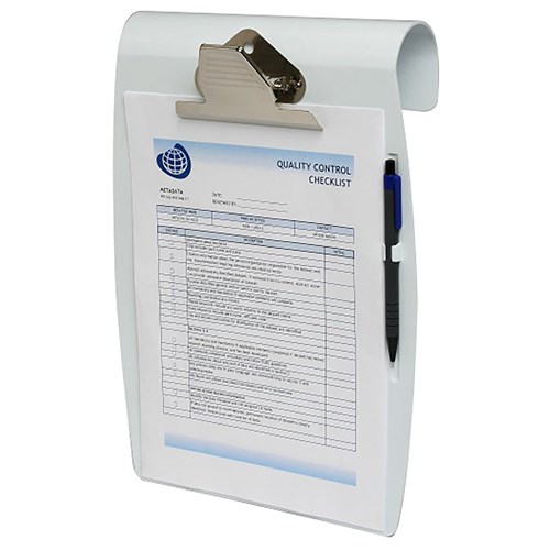 Heavy duty A4 hanging clipboard suitable for use in office, medical, education and industrial environments. Neatly hangs over work stations for a clear work space. Features a sturdy clip to keep documents secure. Includes a pen holder.