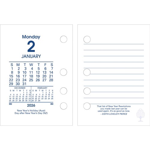Includes special quotes and ''on this day'' notations. Includes Australian and New Zealand holidays and school terms. Sized to suit most standard refill stands.
