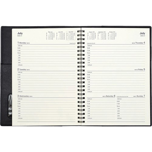 Flexible PVC cover management wiro diary, stitched edges and deluxe pocket inside the cover. Twin wiro allows you to lay the diary flat on your desk. Includes Australian and New Zealand holidays and school terms. Reference calendars. World holidays. 1 hour appointment times 9:00am - 5:00pm. Conversion table. International and National dialling codes. Weights and measures table. International paper sizes. Staff leave. Monthly expenses. Current planner.