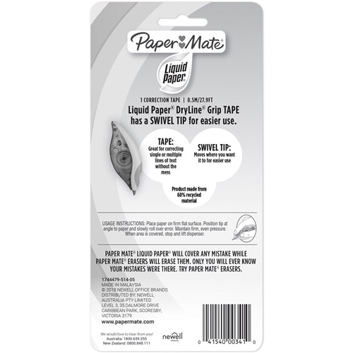 • Paper Mate Liquid Paper Correction Tape Dryline Grip 5mm x 8.5m 60% Recycled