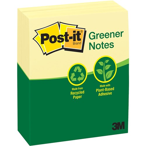 Post-it® Greener Notes in 76mm x 127mm size are made from 100% recycled paper and a plant-based adhesive - which means no new trees were used. The plant material used to make the adhesive was replenished after harvesting.