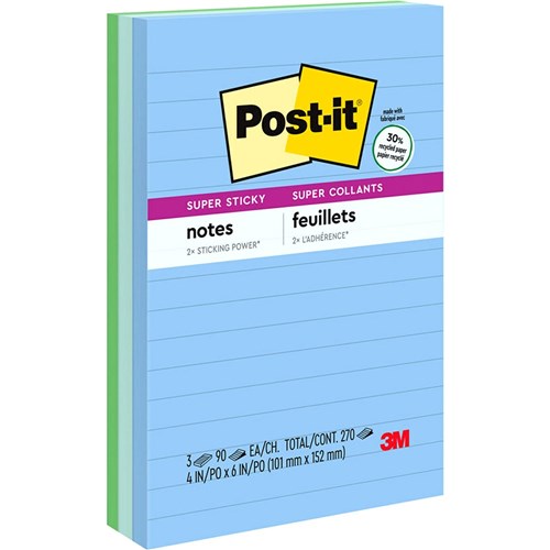 The new generation of adhesive notes. Feature a unique adhesive so your notes will stick securely to even more surfaces. Extra strong hold notes that remove as cleanly as original Post-it® Notes. Stick your Super Sticky Post-it® Notes where they'll really get noticed: monitors, doors, filing cabinets, warehouse boxes and pallets, walls, even at home on the fridge! Made from 30% post consumer waste.