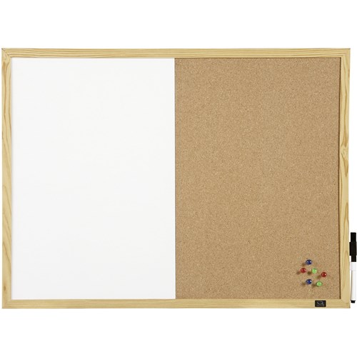 Dual function of written notes with a pinable surface for photos etc. For organising, planning, plotting and jotting. Combination cork bulletin and dry-erase board pulls it all together. Natural pine frame finish suits any interior. Includes 1 marker and wall mounting kit.