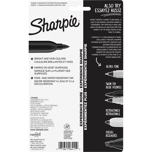 Uncap full-on Neon. Electrify your message, and your audience, with vividly luminous Sharpie Neon Fine Point Permanent Markers. Brilliant in daylight and fluorescent under black light, these Sharpie markers make all of your writing and art pop with electrical impact. Bright in the day, the colors are vivid in natural light. Fluorescent in the dark, the ink glows under black light. Signature Sharpie permanent multi-surface ink writes boldly on paper, plastic, wood, and leather. Quick-drying, AP certified ink formula resists water, smearing, and fading. Tip size: 1.0mm Color: Orange, Green, Pink, Yellow, Blue Pack size: 5
