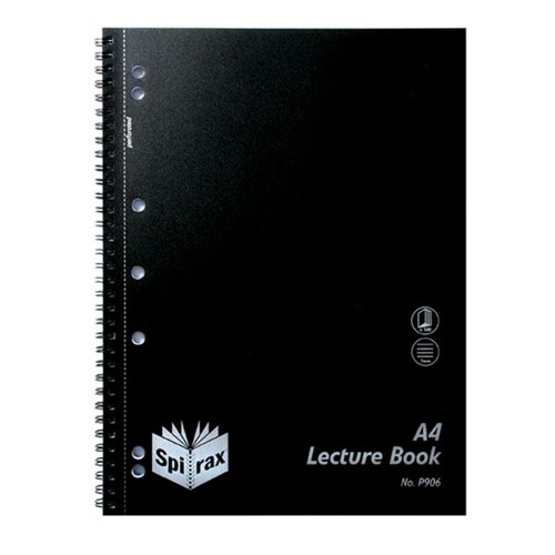 Sturdy and professional black polypropylene cover. 7 hole punched quality paper for use in 2,3 or 4 ring binders. Red ruled margin with 7mm ruling. Spiral bound on the side of the book. Perforated pages allow you to remove and file paper with ease. 140 pages.